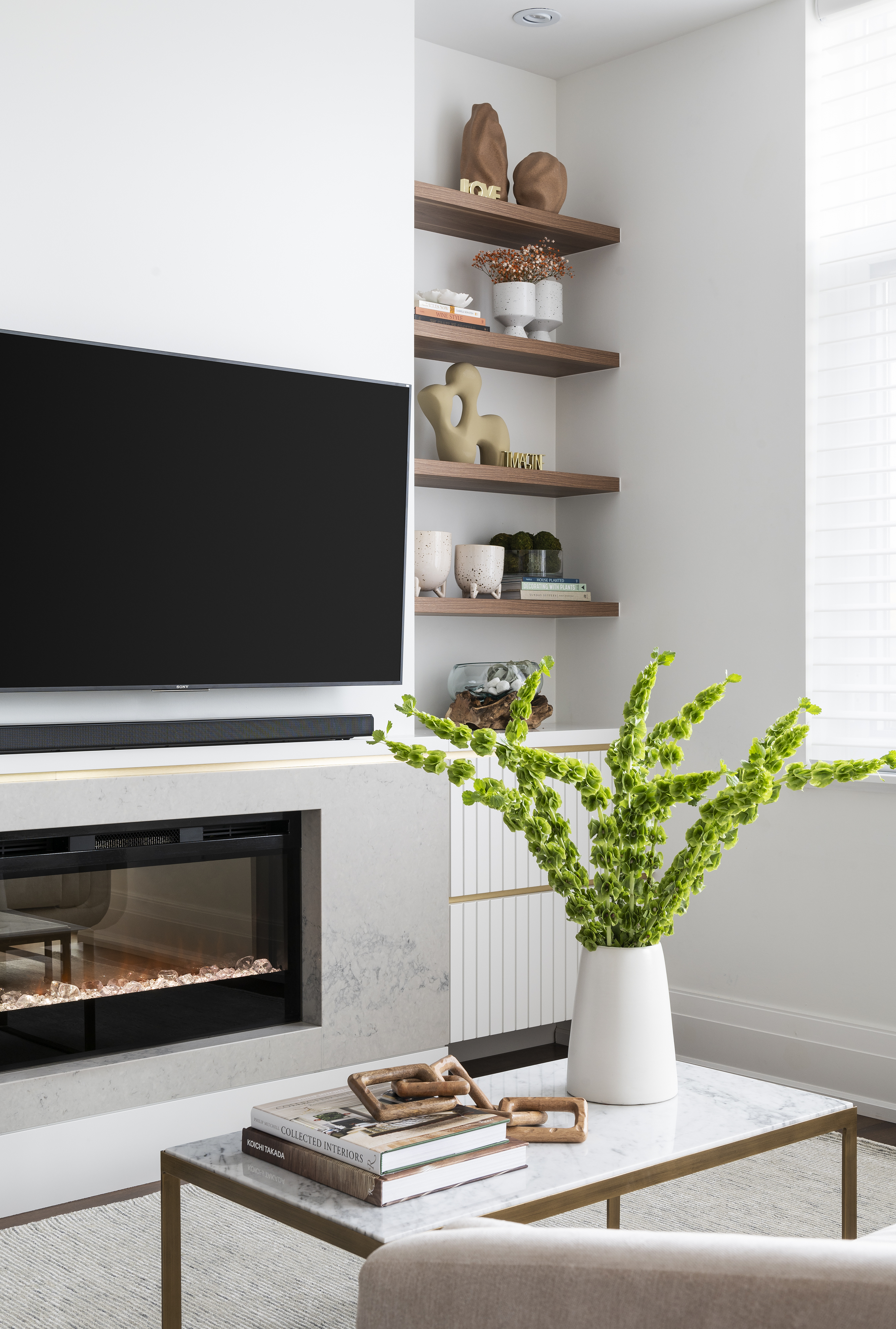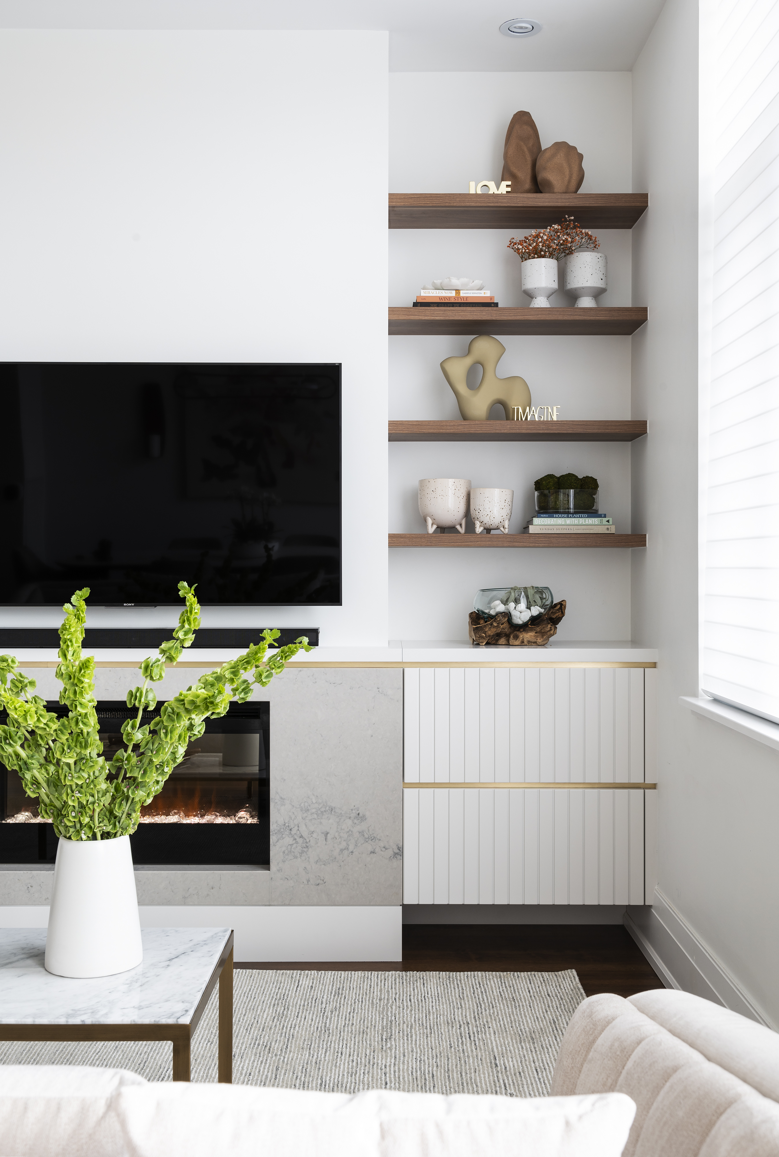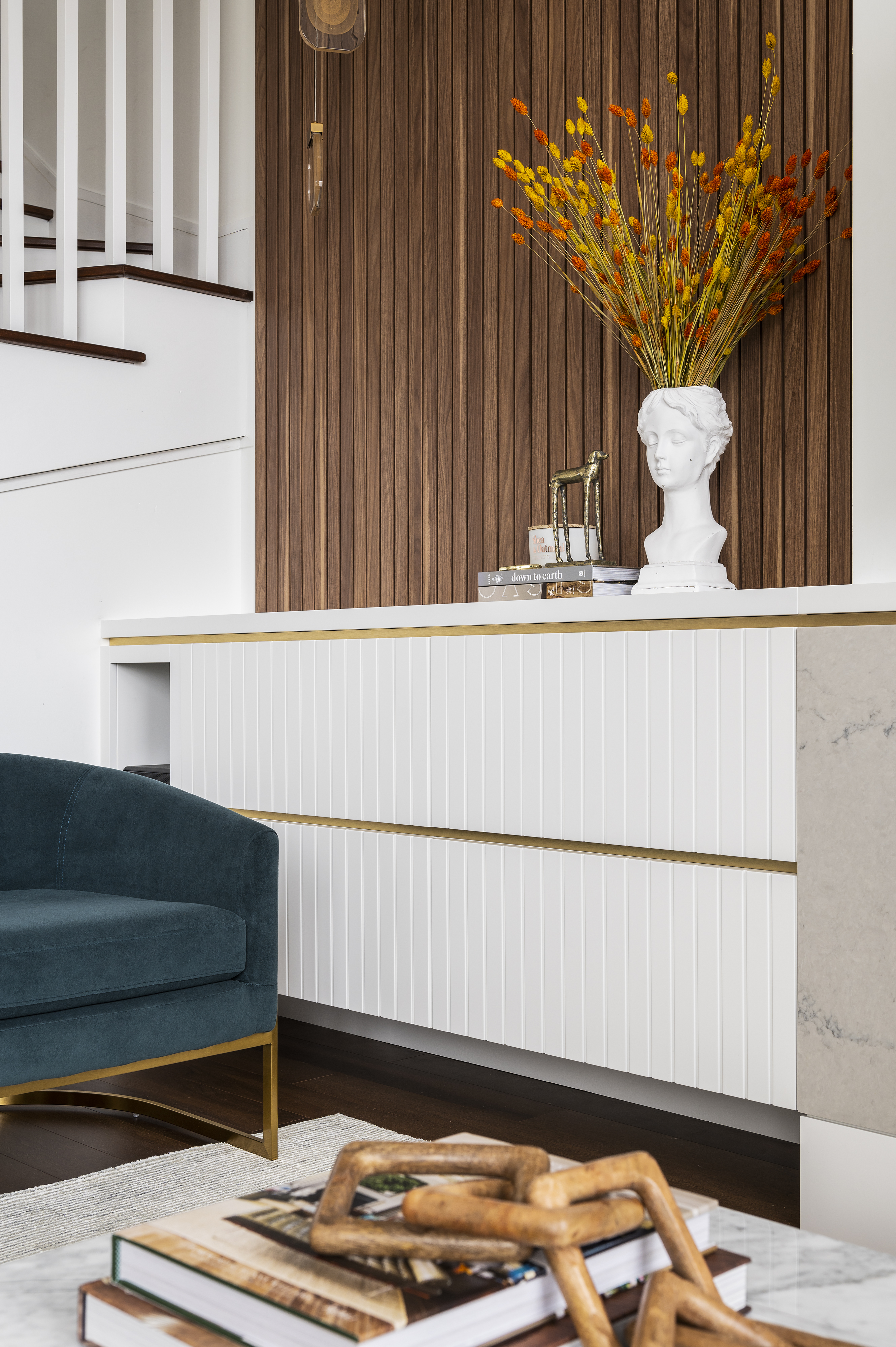 Yet, it's the meticulous attention to detail that truly sets this design apart. Integrated lighting, discreetly nestled within the millwork, adds an extra layer of depth and dimension, casting soft, ethereal beams that dance playfully off the brass and wood panels, infusing the space with a sense of enchantment and wonder. Whether illuminating treasured artifacts displayed on the accent panel beside the fireplace or accentuating the clean lines of the bar area, these subtle yet impactful lights elevate every corner of the home to new heights of sophistication.