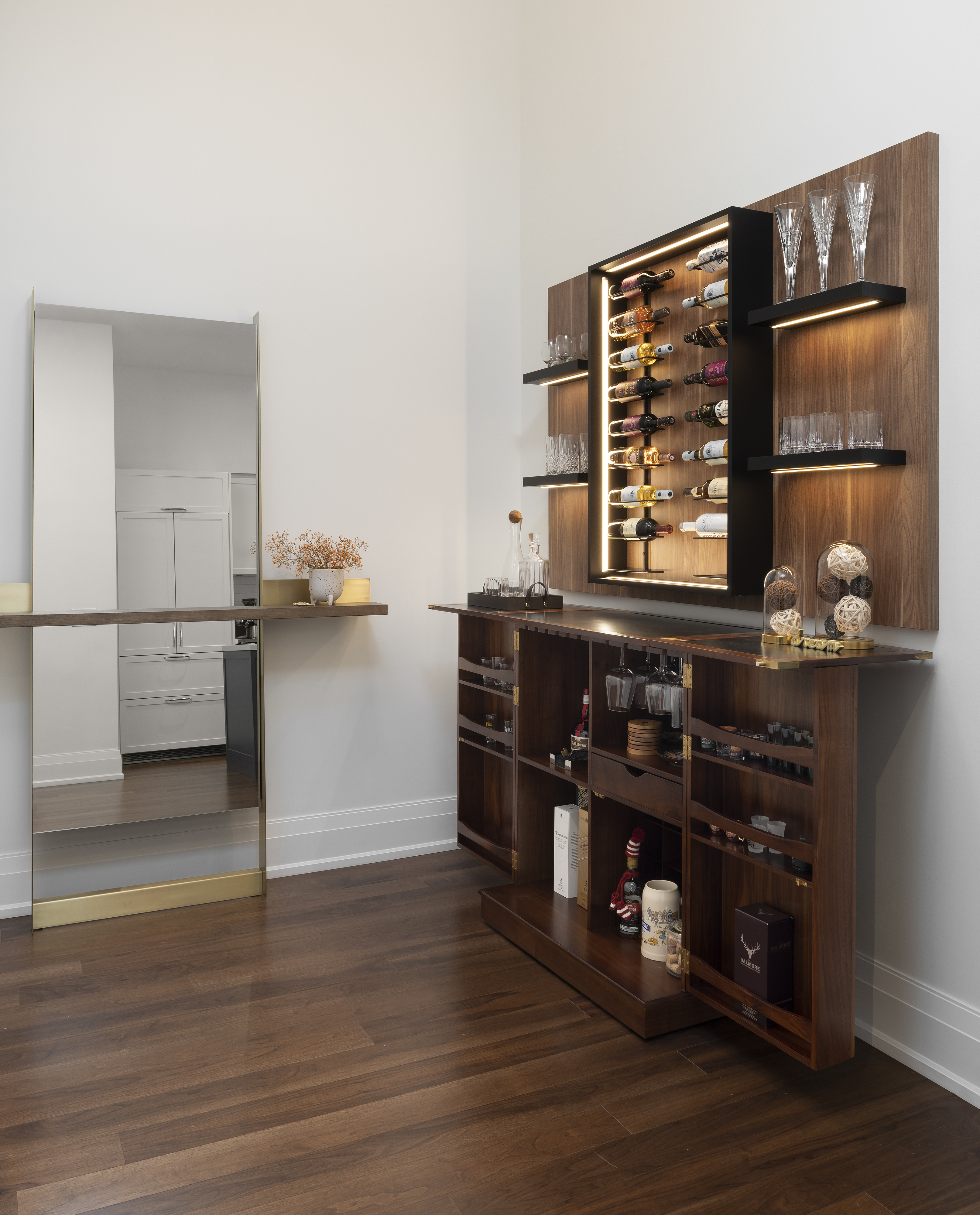 From the moment you step through the door, you're enveloped in an ambiance of refined elegance and understated luxury. The entryway, once a nondescript mudroom, now beckons with the allure of a chic bar area, where brass accents delicately intertwine with sleek surfaces, casting a warm, inviting glow. Mirrored panels, trimmed in brass, serve as both functional elements and aesthetic statements, amplifying the space while reflecting the beauty of the adjacent kitchen, creating an illusion of boundless space and light.