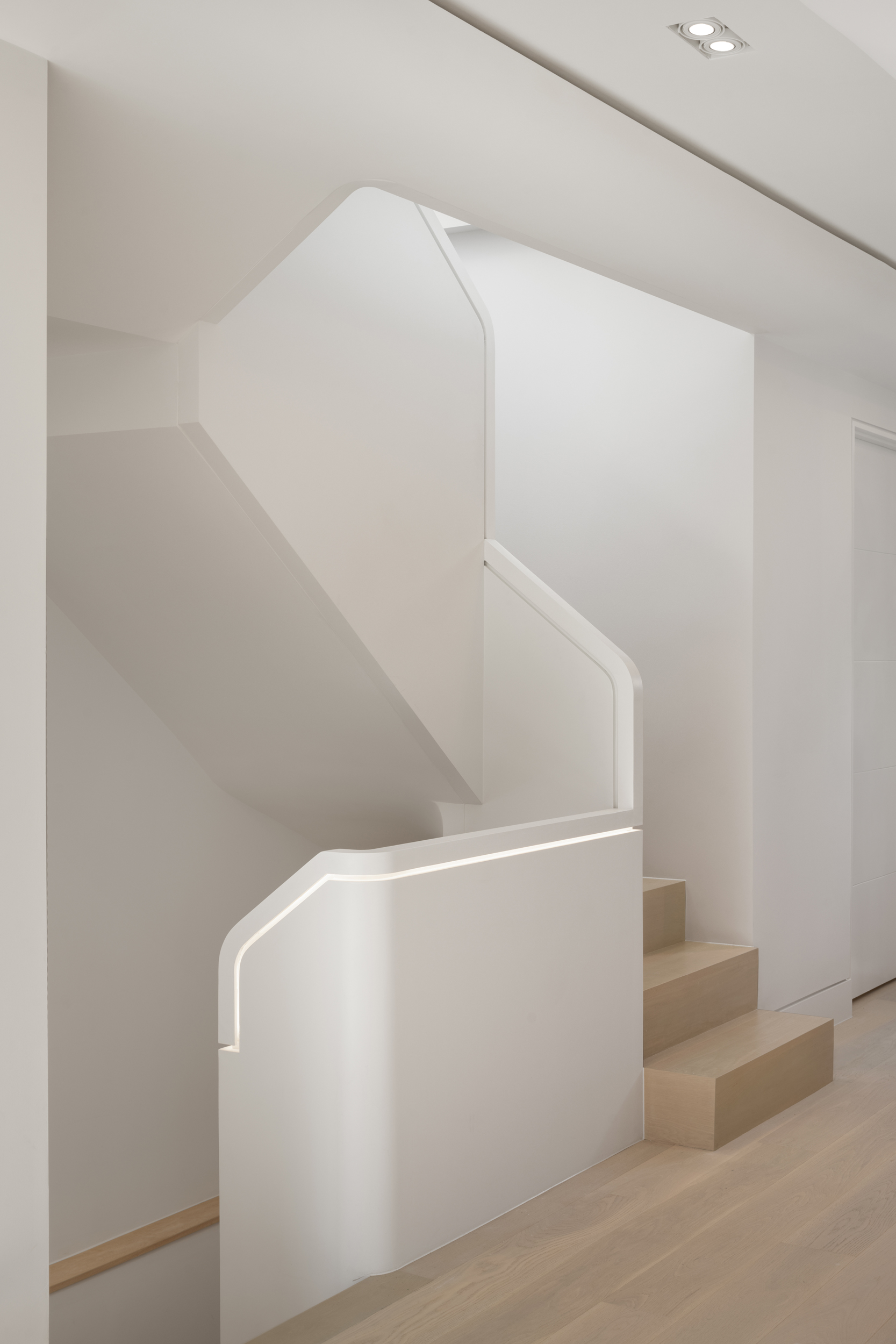 Throughout the home, custom cabinetry has been meticulously designed with smooth radius corners, reinforcing the theme of fluidity while integrating ample storage solutions. This commitment to craftsmanship is further highlighted by an extensive lighting strategy—integrated LED strips subtly illuminate architectural details, from cabinetry and shelving to the staircase and ceiling features, enhancing both ambiance and functionality.