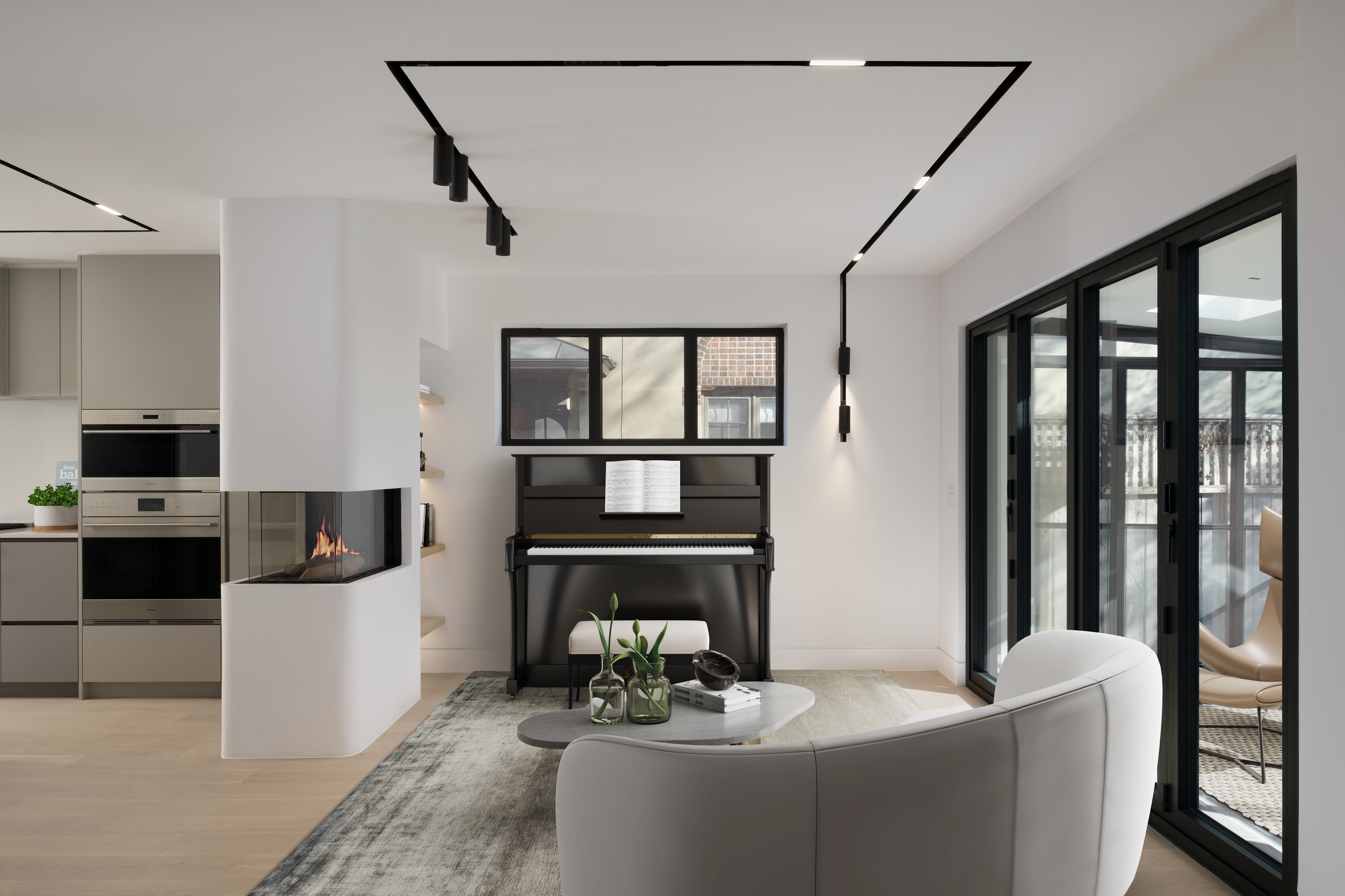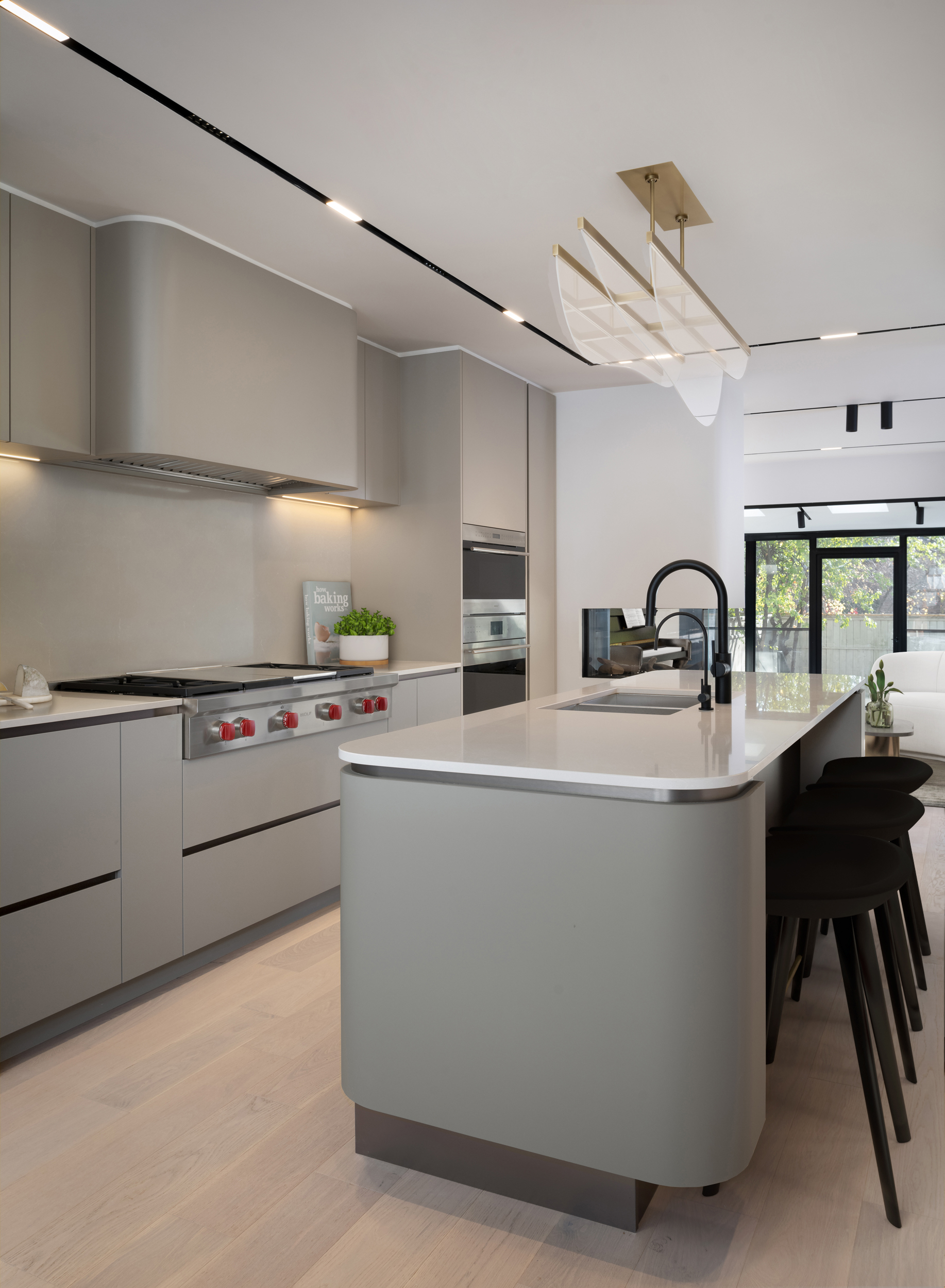 One of the home’s most distinctive design features is a half-sphere drop ceiling that subtly echoes the exterior’s signature archways. This architectural gesture not only bridges the gap between the interior and exterior but also serves as a visual guide, drawing the gaze towards the rear of the house. The thoughtful interplay of curved edges continues throughout, from millwork to cabinetry details, ensuring a cohesive softness that permeates the entire home.