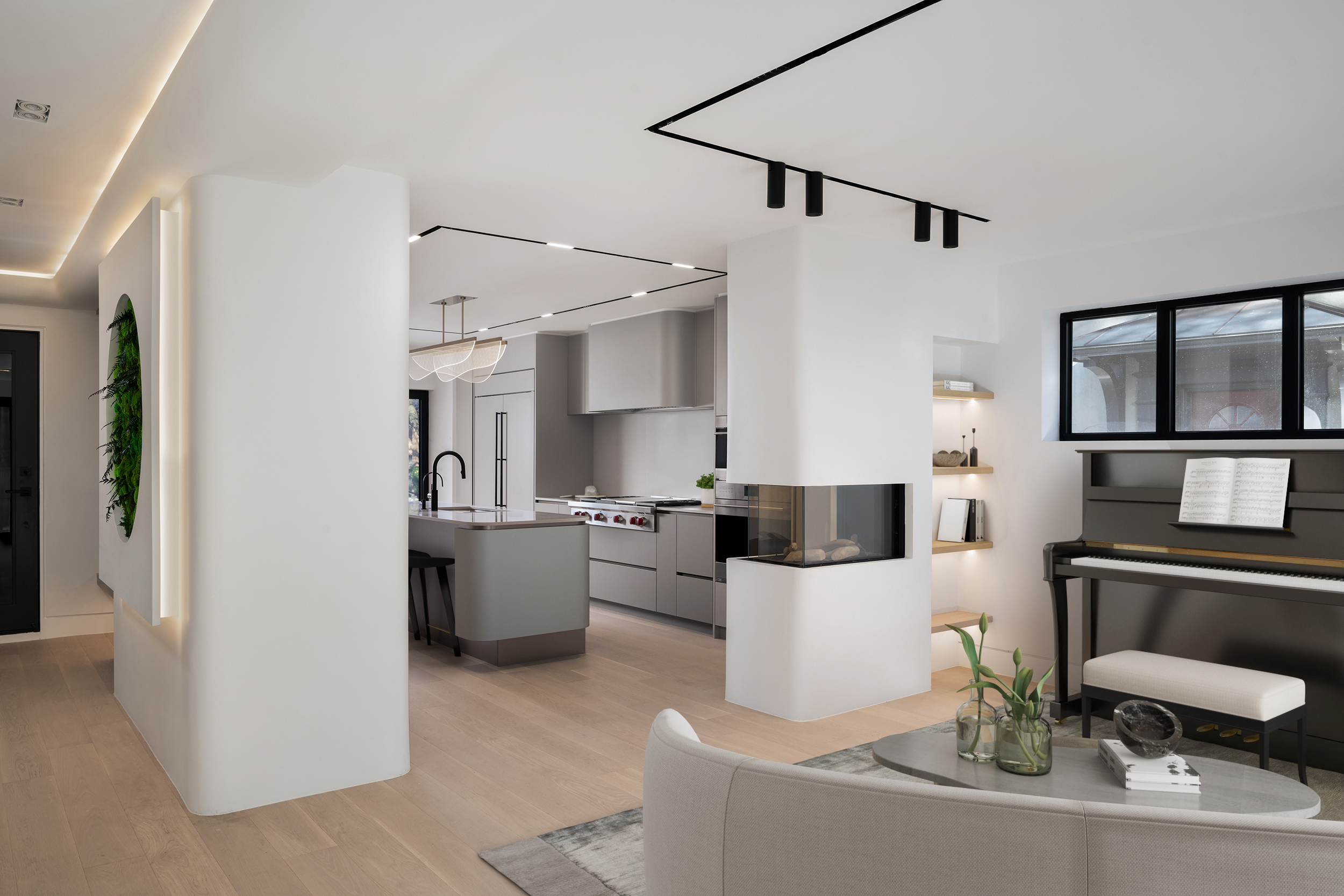 Upon entry, guests are immediately drawn into an environment that celebrates both craftsmanship and continuity. The existing central staircase was repositioned to create a more intuitive and inviting circulation path. A sculptural moss wall feature anchors the entry, juxtaposed against a striking custom staircase with softly curved corners and an integrated lighting system that enhances the natural flow of movement through the home. The staircase’s gentle curves extend upward, leading the eye towards a mezzanine level and fostering a sense of vertical openness.